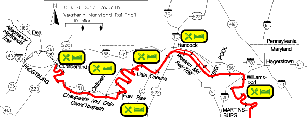 At Cumberland, the Allegheny Trail Alliance system connects with the C&O Canal Towpath. The official web site for the towpath is at the National Park Service. Four good complementary sites are the Potomac Conservancy, the C&O Canal Association, Kathy Bilton's Canal pages, and a biking guide at C&O Canal Biking Guide. The paved Western Maryland Rail-Trail now parallels the towpath for 10 miles from Hancock to Big Pool Maryland.