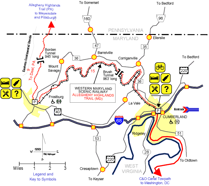 This page is part of the Allegheny Trail Alliance's site in support of the Pittsburgh to Cumberland Trail, a motor-free recreational rail trail connecting Pittsburgh PA and Cumberland MD. Copyright © 1998, 1999, 2000 by Allegheny Trail Alliance, Bill Metzger, Mary Shaw, and Roy Weil. Amenity information courtesy of FreeWheeling Easy. We encourage you to create links to this site and to print copies of the maps for your personal use. We prohibit other uses of this site, especially if they generate spam or other mass communications -- see our Privacy Policy.. This page was last modified on 09/03/00. Send email to ATA or contact the ATA or member trails.