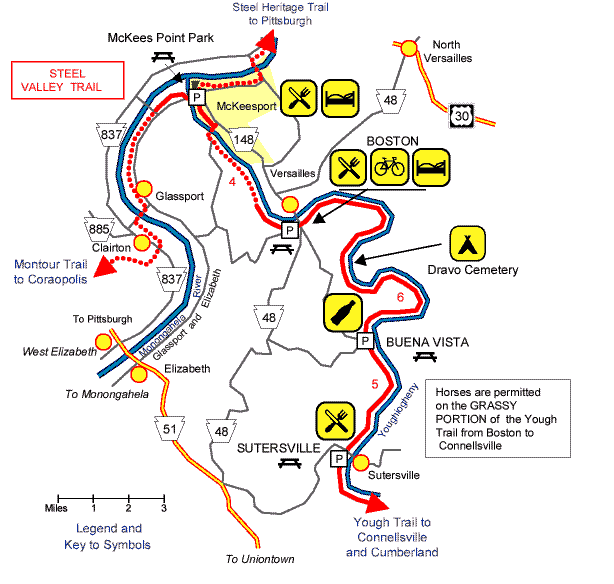 This page is part of the Allegheny Trail Alliance's site in support of the Pittsburgh to Cumberland Trail, a motor-free recreational rail trail connecting Pittsburgh PA and Cumberland MD. Copyright © 1998, 1999, 2000 by Allegheny Trail Alliance, Bill Metzger, Mary Shaw, and Roy Weil. Amenity information courtesy of FreeWheeling Easy. We encourage you to create links to this site and to print copies of the maps for your personal use. We prohibit other uses of this site, especially if they generate spam or other mass communications -- see our Privacy Policy.. This page was last modified on 09/03/00. Send email to ATA or contact the ATA or member trails.