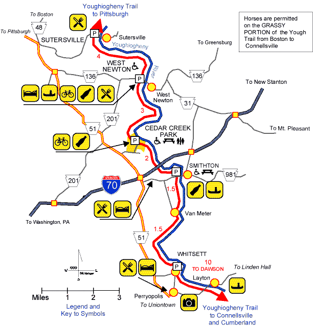 | This page is part of the Allegheny Trail Alliance's site in support of the Great Allegheny Passage, a motor-free recreational rail trail connecting Pittsburgh PA and Cumberland MD. Copyright © 1998, 1999, 2000, 2001by Allegheny Trail Alliance, Bill Metzger, Mary Shaw, and Roy Weil. Amenity information courtesy of FreeWheeling Easy. We encourage you to create links to this site and to print copies of the maps for your personal use. We prohibit other uses of this site, especially if they generate spam or other mass communications -- see our Privacy Policy.. This page was last modified on 09/11/02. Send email to ATA or contact the ATA or member trails. | ||||||